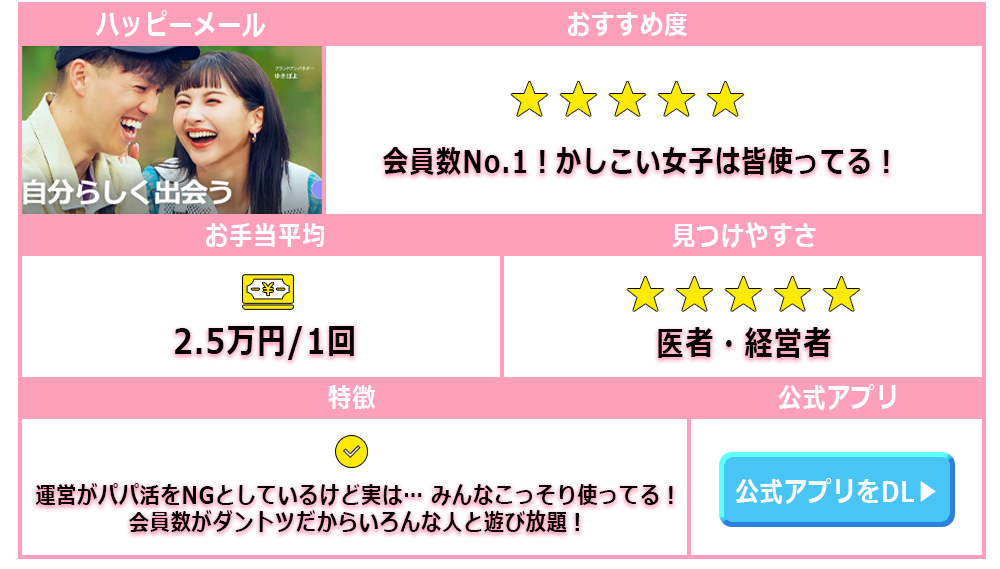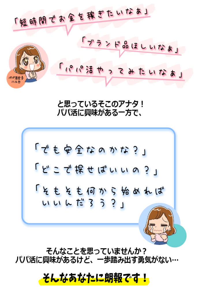長く太く助けてくれるパパを見つけるためにも、まずは今日紹介したことをヒントに第一歩を踏み出していただいて、ゆくゆくはたくさんのパパに支援していただいてたっぷりお手当をいただける女子になりましょう(笑)